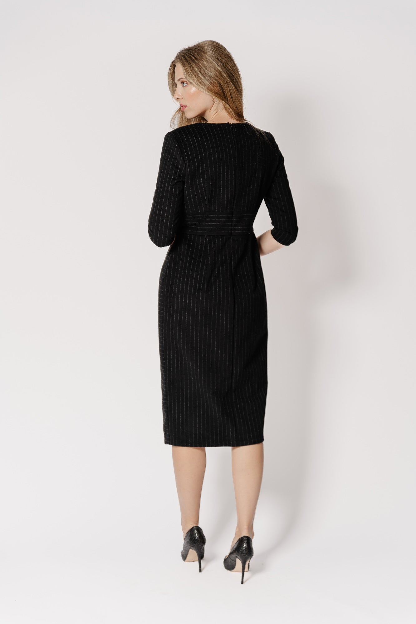 Stap in een wereld van tijdloze elegantie met onze 'Celeste'-jurk. Gemaakt van luxe Italiaanse wol in een rijke zwarte tint, straalt deze jurk verfijnde charme uit. Het subtiele krijtlijnpatroon voegt een speelse touch toe, waardoor u moeiteloos opvalt.