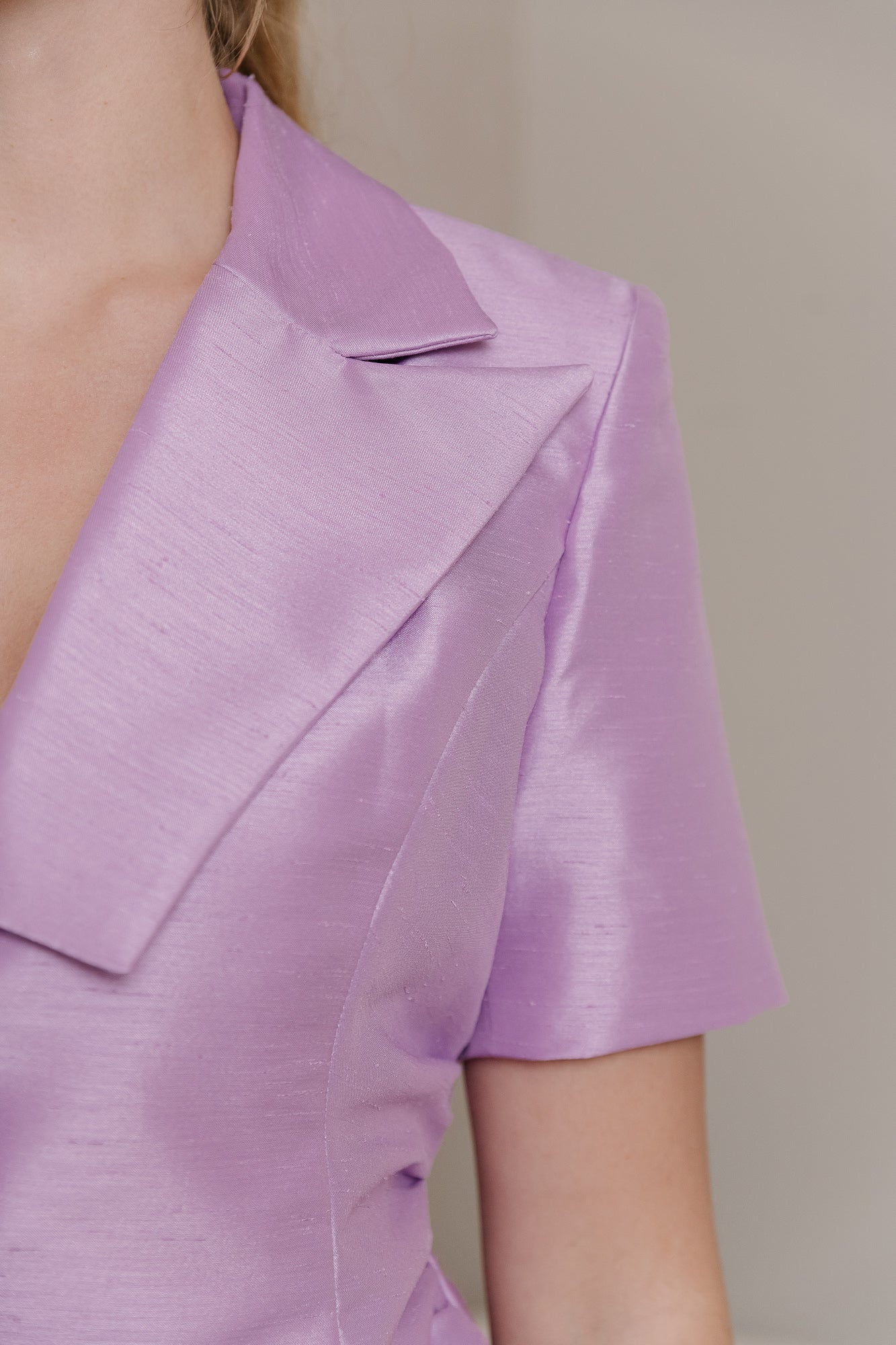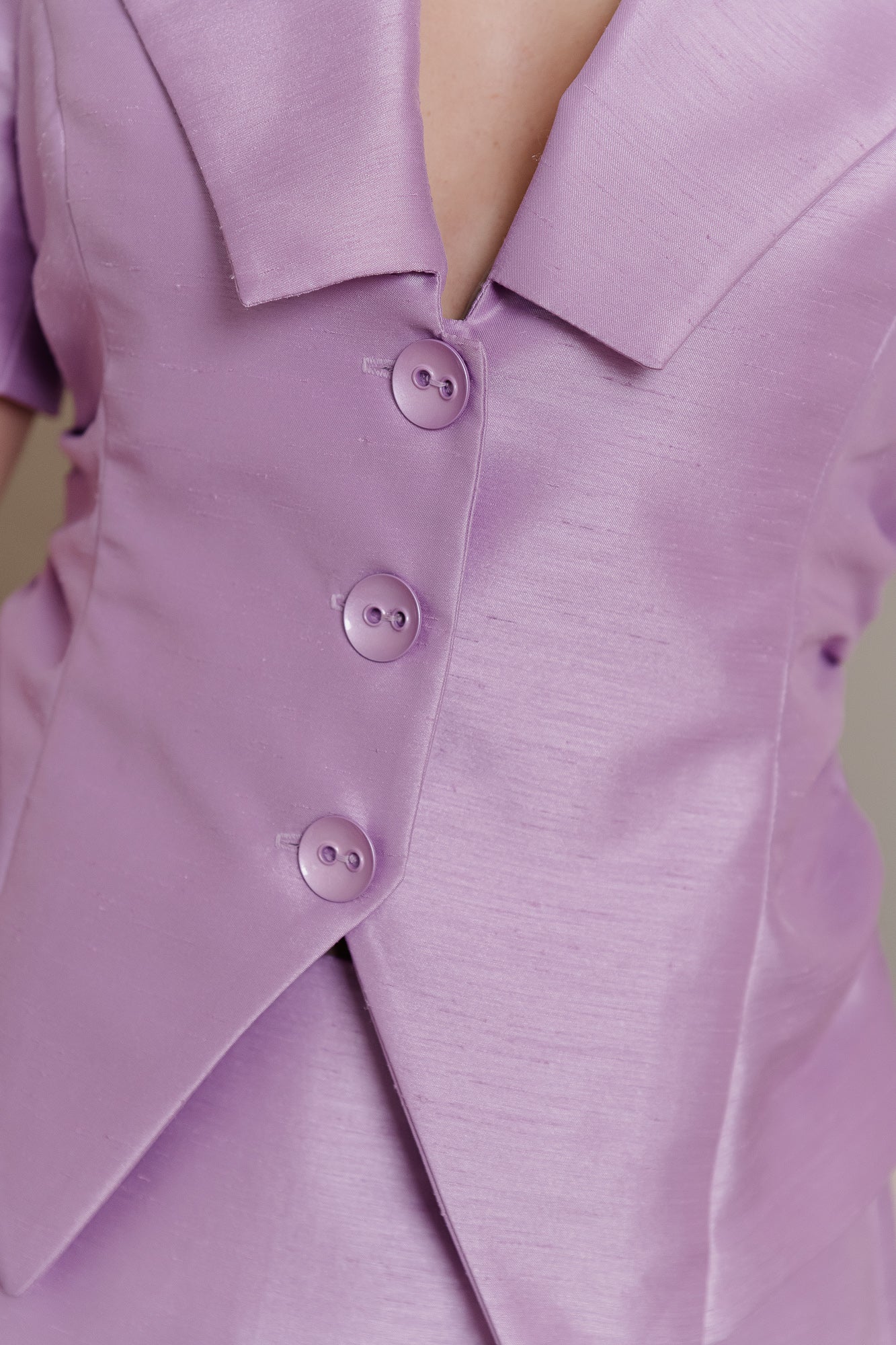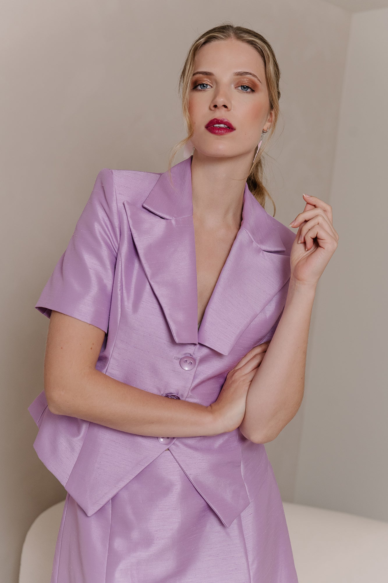 The accompanying blazer is a true statement piece, featuring short sleeves and eye-catching buttons that draw attention. The gathered details at each side of the waist create a slimming effect, enhancing your silhouette while adding a modern twist to classic tailoring.