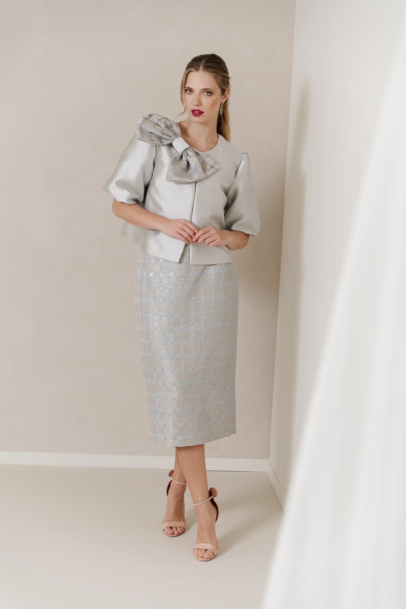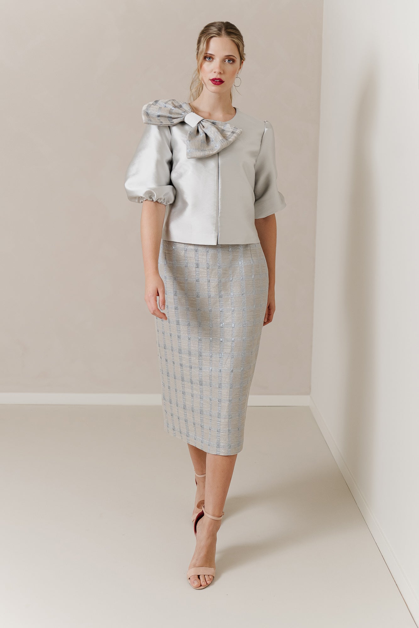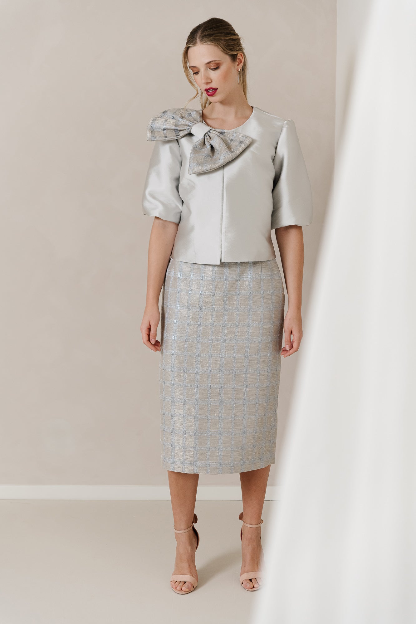 Pair this with the stunning satin blouse, complete with voluminous sleeves and a deep pleat at the back, and you've found the perfect balance between chic and trendy. The eye-catching bow in the same fabric as the skirt adds a playful touch, ensuring you’re always the center of attention.