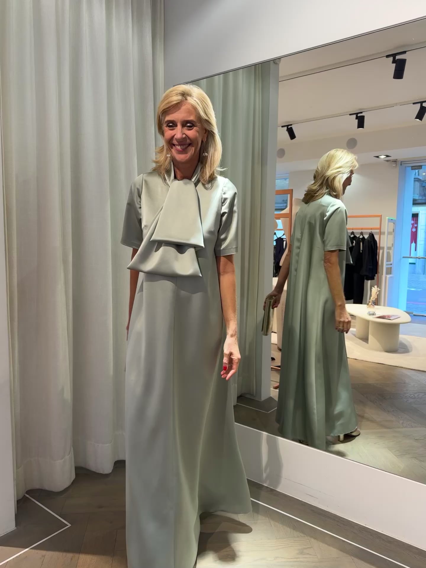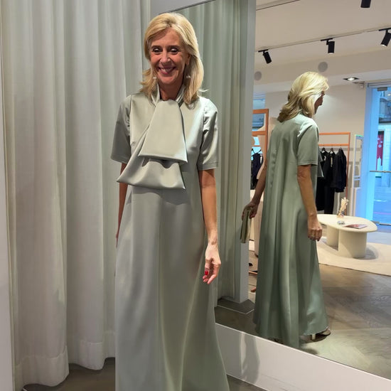 A long dress made from satin with a refined, structured drape. The fabric feels luxurious and gives the dress a clean, elegant look.