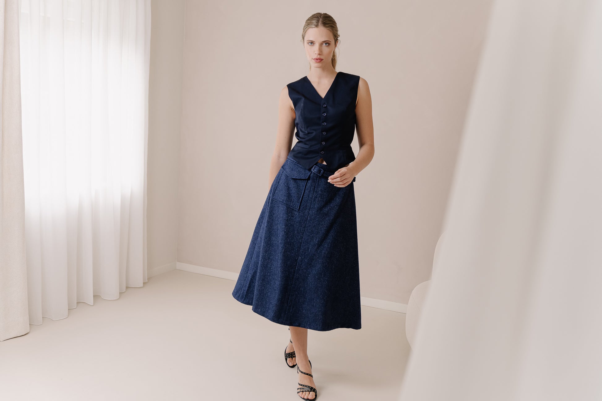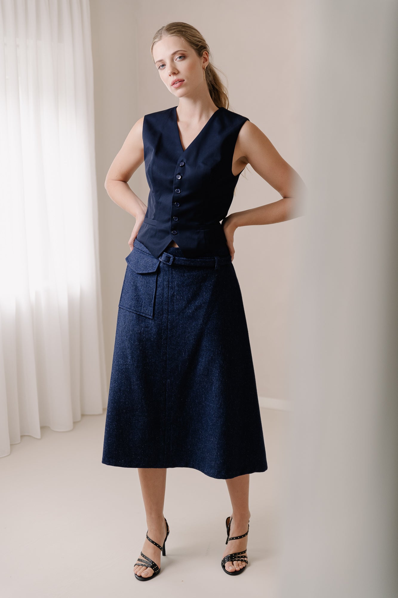 Introducing the 'Grace' jacket, a stunning sleeveless design that redefines elegance and versatility. This jacket, featuring chic button detailing, effortlessly complements the 'Grace' skirt for a look that is both sophisticated and fresh.