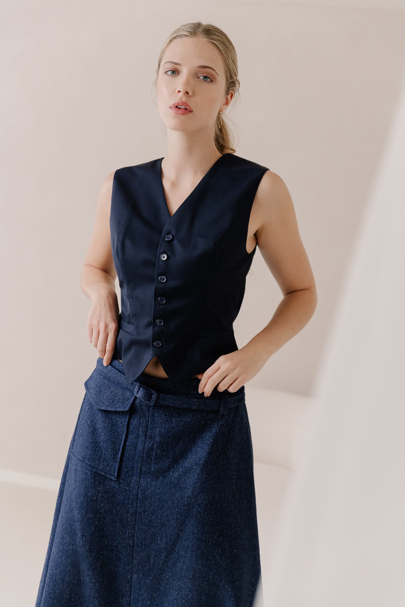 - Fitted waistcoat with linear buttons